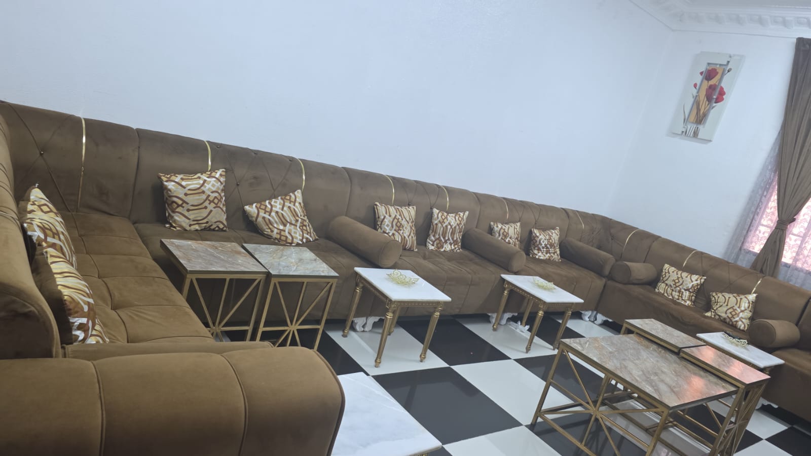 14 seater majlis style sofa set with white square tables. Good condition